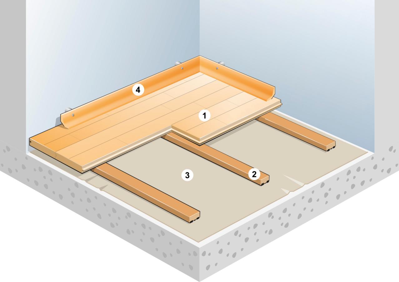 Junckers 22 mm massive parketbrædder sømmes til et fjedrende underlag af laminerede strøer og for at opnå optimal fjedring af gulvet, er der under strøerne på langs i en “U” formet fræsning præmonteret en specialdesignet fjedrende foam. Dette design skaber en naturlig deformationsbegrænsning og sikrer mangeårig funktionalitet af gulvet.