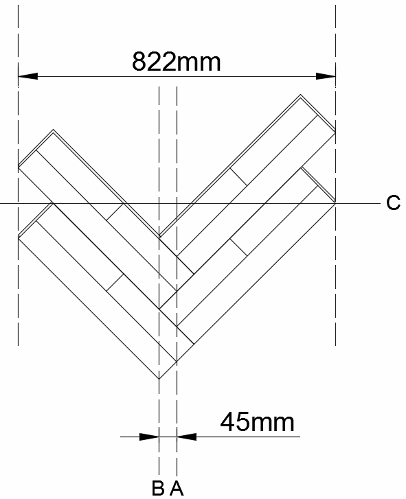 45 mm til venstre for midterlinjen A trækkes en arbejdslinje med snor eller kridtstreg (linje B).