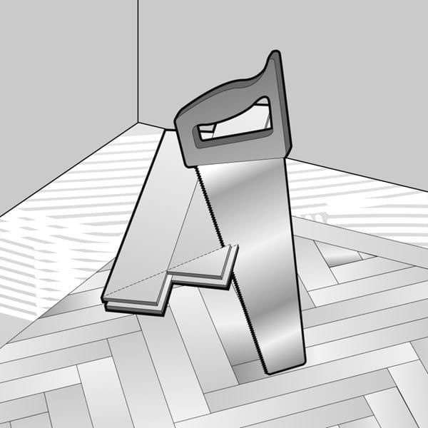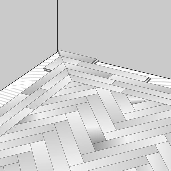 Skal gulvet afsluttes med en bort ved væggene, afskæres gulvet i den ønskede afstand fra væggen svarende til den ønskede bredde på borten, f.eks. 2 x stavbredden + luft ved væggen.
