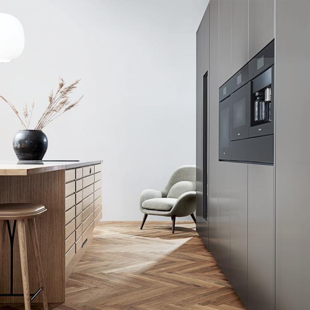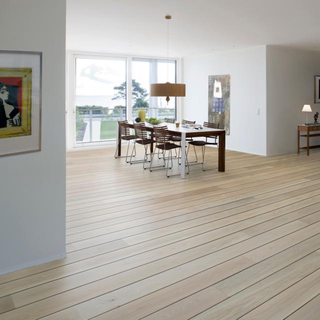 Vælg et parketgulv for at opnå et større spil i træets udtryk eller et plankegulv for at understøtte det rolige indtryk.
