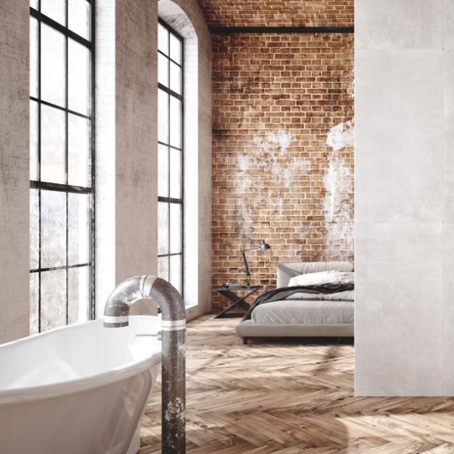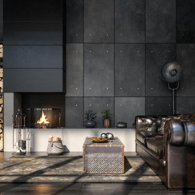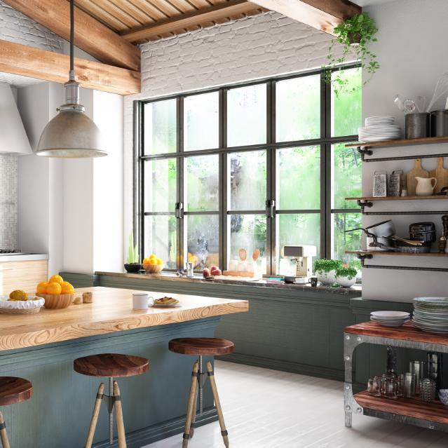 Stilen handler om at give plads til det rustikke og upolerede, men på en stilfuld og moderne måde. Det kan for eksempel være med stålreoler, arbejdslamper i metal, betonborde eller bordplader.